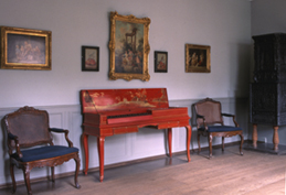 Dass der Raum als Musikzimmer genutzt wurde, verrät der Deckenstuck mit den Musikinstrumenten. In der Familie Goethe wurde viel musiziert: Der Vater spielte Laute, Johann Wolfgang Cello, Cornelia Klavier und die Mutter sang. Den Raum beherrscht eine Rarität: ein aufrechtes, auch Pyramidenflügel genanntes Hammerklavier von Christian Ernst Friderici. Über dem roten Clavichord zeigt ein Gemälde nach Johann Conrad Seekatz die Familie Goethe – Johann Caspar, Catharina Elisabeth, Johann Wolfgang und Cornelia – in Schäfertracht vor einer Ideallandschaft.